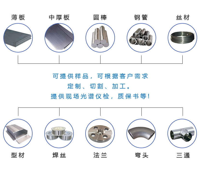 有薄板(ban) 中厚板(ban) 圓(yuan)棒 鋼管 絲材(cai) 型材(cai) 焊絲 盤圓(yuan) 法蘭 彎頭 三通等各種規格型(xing)號,可根據(ju)客戶需(xu)求定制(zhi)、切割、加工(gong)。