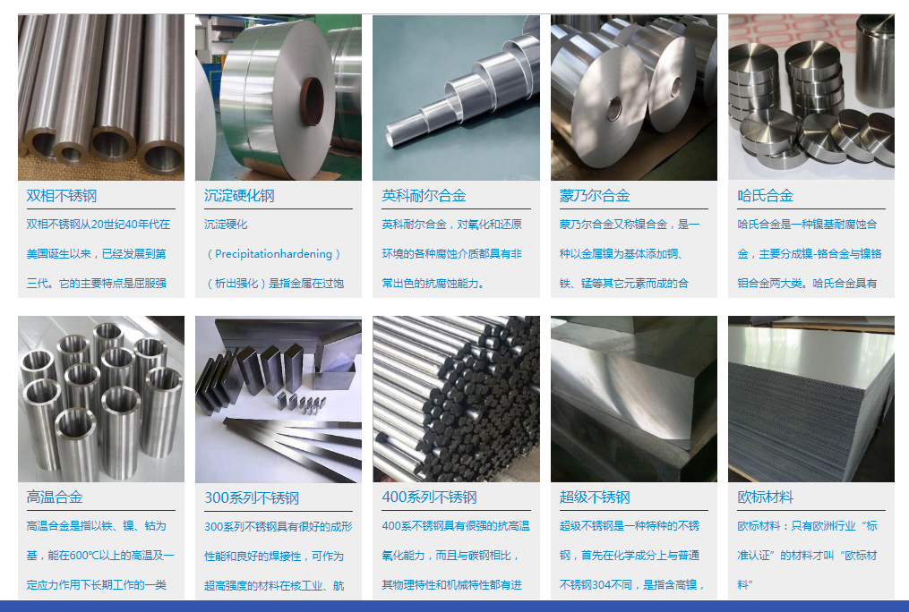 與歐美(mei)(mei)日(ri)本(ben)(ben)等各大(da)鋼廠有著廣(guang)泛的業務來往,常年供(gong)應鎳基合(he)金(jin)(jin)、鎳鈷基耐熱合(he)金(jin)(jin)、高耐腐蝕(shi)合(he)金(jin)(jin)、超(chao)級奧氏體不(bu)銹(xiu)鋼、鈦及鈦合(he)金(jin)(jin)、純鎳等特種合(he)金(jin)(jin)材料(liao)。公司所有產(chan)品(pin)按DIN/EN、美(mei)(mei)國(guo)ASTM/ASME、德國(guo)DIN、日(ri)本(ben)(ben)JIS等標(biao)準供(gong)應,并可根據客戶(hu)提(ti)供(gong)的標(biao)準和技術要(yao)求供(gong)貨,可供(gong)產(chan)品(pin)形態:板、帶、管(guan)(無縫(feng)管(guan)及焊管(guan))、棒、鍛(duan)件、管(guan)件、法蘭和焊材等。