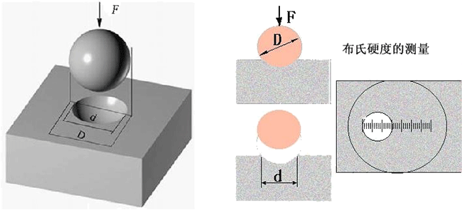 布氏硬度的符號用 HBS或HBW表示。適用于鑄鐵、非鐵合金、各種退火及調質的鋼材,不宜測定太硬、太小、太薄和表面不允許有較大壓痕的試樣或工件。其原理是如下圖所示以一定的載荷(一般3000、750kgf、187.5mm等)將一定大小(直徑為10mm、5mm、2.5mm)的淬硬鋼球或硬度合金球壓入材料表面,經規定保持時間后,卸除試驗力,測量試樣表面壓痕的直徑。布氏硬度與試驗力除以壓痕表面積的商成正比。壓痕被看做是卸載后具有一定半徑的球形,壓痕的表面積通過壓痕的平均直徑和壓頭直徑按照相關公式計算可以得到。負荷與其壓痕面積之比值,即為布氏硬度值(HB),單位為公斤力/mm2(N/mm2)。