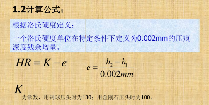 洛氏硬度的試驗原理是用一個頂角為120°的金剛石圓錐體或直徑為1.59mm的球形壓頭,分兩級試驗力(初實驗力F0和總試驗力F1)先后作用下,將規定的壓頭壓入試樣表面,保持一定的時間后卸除主試驗力F1,在保留初試驗力F0下測量殘余壓痕深度e,100(或130)減去e值下面的這個公式求取材料的硬度(可以直接讀取)。