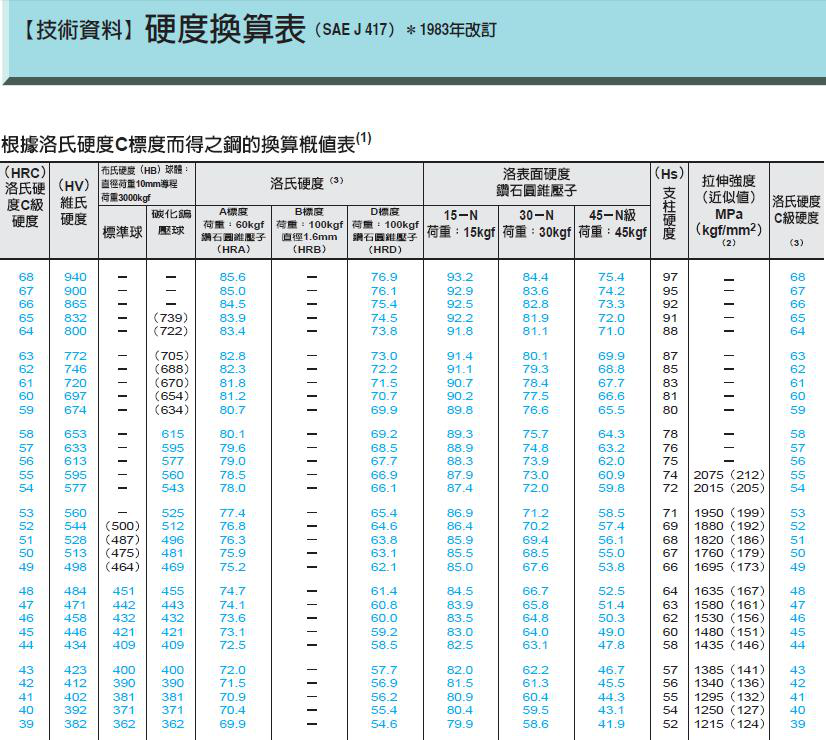 實踐證明,金屬材料的各種硬度值之間,硬度值與強度值之間具有近似的相應關系。因為硬度值是由起始塑性變形抗力和繼續塑性變形抗力決定的,材料的強度越高,塑性變形抗力越高,硬度值也就越高。但各種材料的換算關系并不一致。其中SAE J417、GB/T1172、GB/T33362 、ASTM E140等可以提供有色金屬和黑色金屬的強度與硬度對應的關系,但尚無普遍適用的方法將洛氏硬度值精確地換成其他硬度或抗拉強度,因此應避免這種換算,除非通過對比試驗得到可比較的換算方法。下圖是上述相關標準SAEJ 417 中的數據圖片: