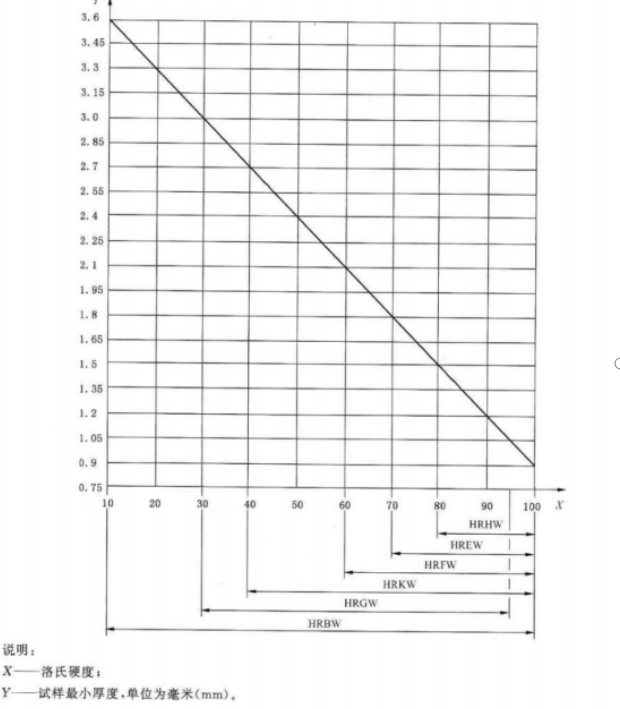洛氏硬度試驗采用測量壓入深度的方法,硬度值通過指示直接讀出,因此操作簡單方便,容易掌握,工作效率高,測量迅速,成為最常用的硬度試驗方法之一,并且由于試驗力較小,壓痕也小,特別是表面洛氏硬度的壓痕更小,對大多數工件的使用無影響,可直接測試成品工件,初試驗力的采用,使得試樣表面輕微的不平度對硬度值的影響較小,因此,此儀器非常適于對成批的成品或半成品進行逐件檢測。還可以通過硬度值對工藝進行調整,得到最佳的熱處理工藝,但要考慮到在相同的熱處理工藝下,材料的含碳量越高,材料的硬度也越高。對應于相同的材料,同工藝引起的硬度高低順序是:淬火、正火、退火。另外洛氏硬度試驗對試樣是有要求的,其厚度不能小于殘余壓痕深度的10倍,試樣背面不能出現明顯的變形痕跡。由此試樣的厚度決定了試驗力的選擇,試驗力必須保證其所引起的變形小于試樣的最小厚度。對于每一種硬度試驗,都存在最小可測量厚度。如下圖就是國標中一些標尺所對應的試樣最小厚度曲線圖。